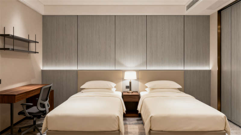 本設計以現(xiàn)代輕奢為核心風格,為蚌埠這家酒店打造出兼具質(zhì)感與溫度的居住體驗。整體空間以低飽和的米灰色系為基底,搭配胡桃木的溫潤與金屬線條的精致,構(gòu)建出統(tǒng)一且富有層次的視覺效果。?