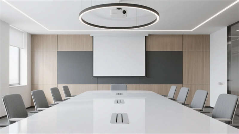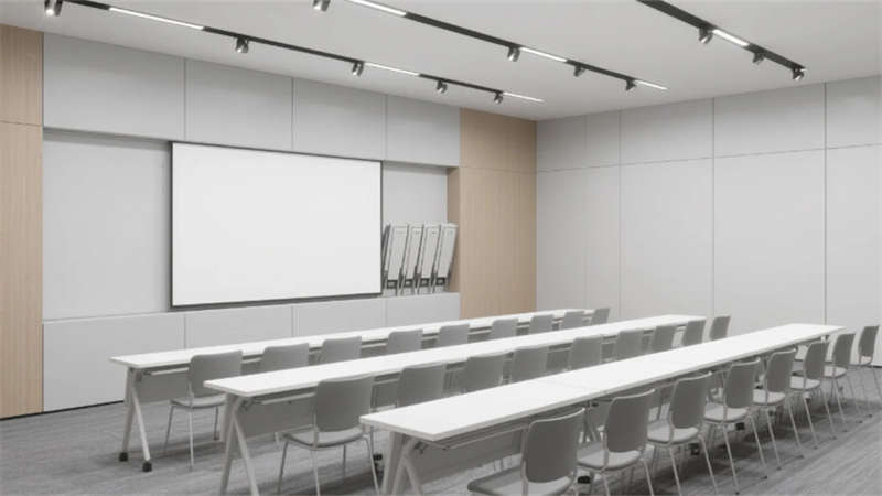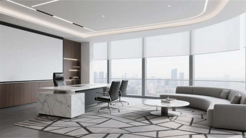 高管辦公空間彰顯差異化設計:經理辦公室以木格柵墻面與模塊沙發營造親和力,總裁辦公室則通過深胡桃木隱形門、弧形沙發與城市景觀落地窗凸顯沉穩氣度。多功能廳采用可伸縮隔斷與嵌入式LED屏,適應培訓、會議等多場景需求;茶水間以中島吧臺與幾何層板打造輕松社交空間,筒燈聚焦的綠植墻增添生機。