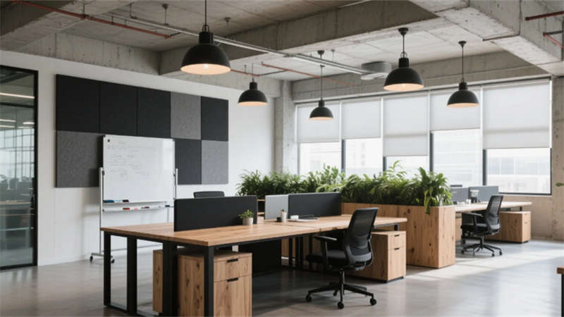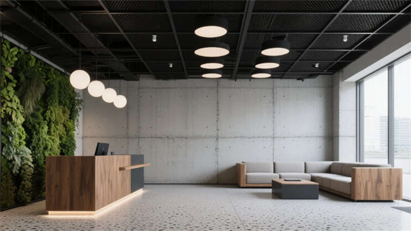 步入大堂,粗獷的混凝土墻面與水磨石地面形成質(zhì)感對(duì)話,懸浮金屬網(wǎng)天花下,原木前臺(tái)與背光綠植墻暈染出溫潤(rùn)生命力。開(kāi)放式辦公區(qū)延續(xù)工業(yè)基調(diào),模塊化橡木桌搭配黑色鋼架,綠植隔斷巧妙劃分空間,自然光穿過(guò)智能遮陽(yáng)簾,在混凝土天花上投下流動(dòng)的光影詩(shī)行。
