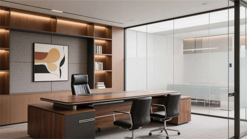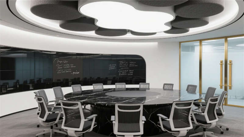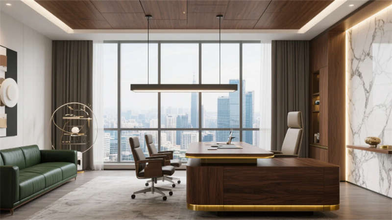 私密空間演繹克制的精致:經(jīng)理辦公室玻璃隔斷內(nèi),胡桃木書(shū)桌與毛氈吸音墻平衡理性與溫度;總裁套間則以大理石暗光墻面對(duì)話城市天際線,黃銅細(xì)節(jié)點(diǎn)亮低調(diào)的尊崇。會(huì)議室黑石長(zhǎng)桌與磁吸玻璃書(shū)寫(xiě)面碰撞靈感,而公共休息區(qū)陶土花盆與橄欖綠軟墊,在混凝土中島上生長(zhǎng)出松弛的煙火氣。