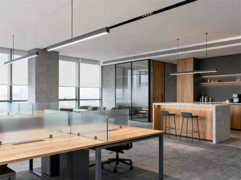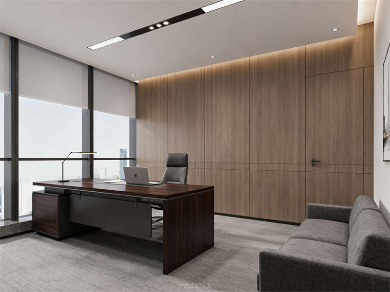 開放辦公區(qū)以通透協(xié)作為設(shè)計(jì)重點(diǎn),半透明磨砂玻璃隔板兼顧隱私與互動(dòng),木色桌面與深灰金屬支架結(jié)合,延續(xù)整體材質(zhì)基調(diào),搭配簡約照明,營造專注且不壓抑的工作氛圍。獨(dú)立辦公室劃分出辦公與接待區(qū)域,木飾面背景墻搭配淺灰布藝沙發(fā),在保持商務(wù)感的同時(shí),增添柔和質(zhì)感,滿足私密溝通需求。