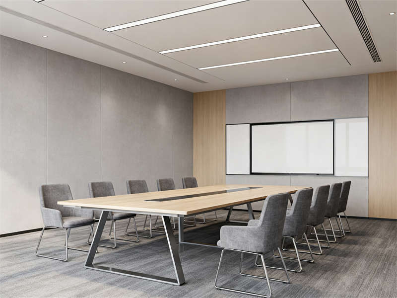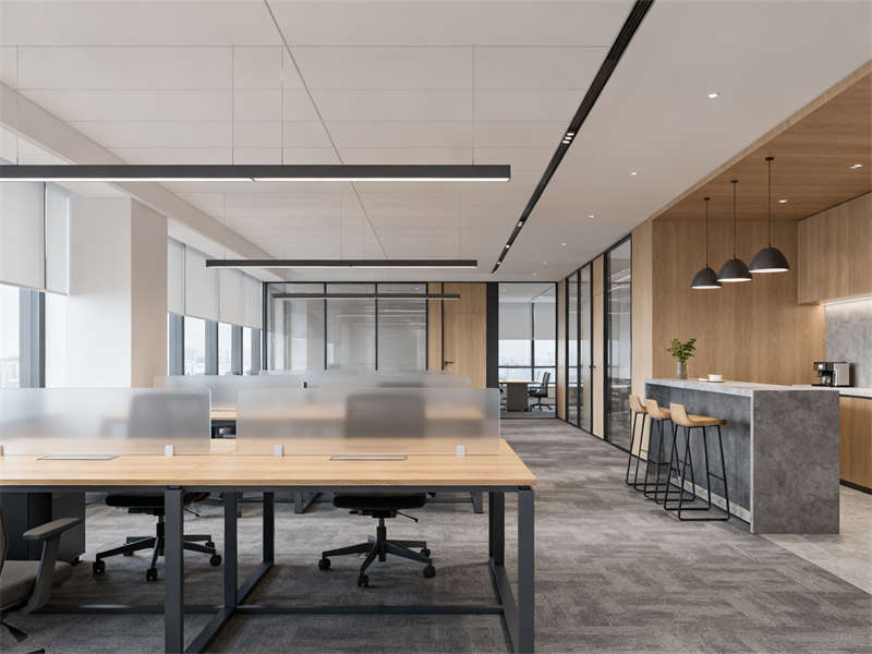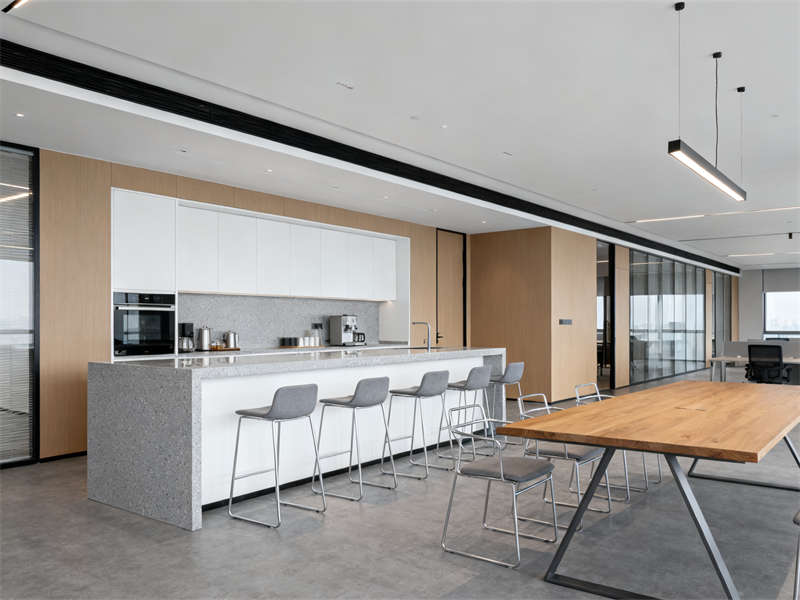 中型會(huì)議室圍繞協(xié)作功能展開,長條式會(huì)議桌與玻璃隔斷搭配,既保證空間開闊,又能與外部辦公區(qū)形成視覺聯(lián)動(dòng),灰色布藝座椅與頂部圓形吊燈呼應(yīng),讓會(huì)議場景兼具功能性與舒適感。茶水間則通過淺灰石英石臺(tái)面、木色護(hù)墻板與暖光燈帶,營造輕松休閑的氛圍,成為辦公間隙的放松節(jié)點(diǎn)。