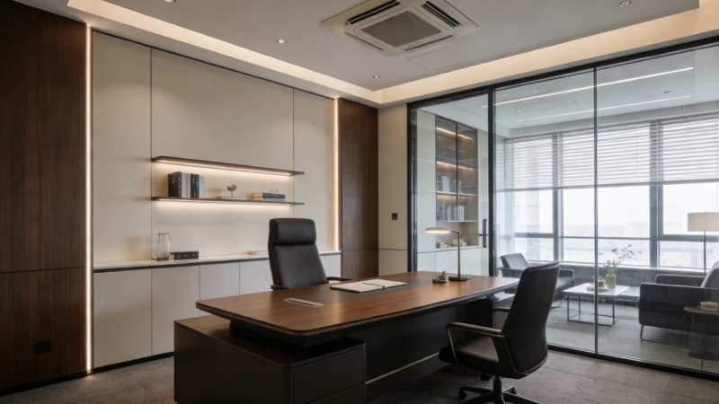 融入智能環境控制系統,自動調節溫濕度與燈光;搭配人體工學家具、中央新風系統,為員工筑牢健康屏障。整體采用現代簡約風格,摒棄冗余裝飾,通過色彩與材質碰撞凸顯企業質感,同時預留品牌文化植入空間。