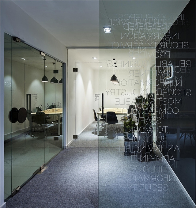 業主希望突出公司的科技感,主要就以黑白為主,玻璃上的裝飾采用正反拼貼,營造出慢慢消印的代碼的科技感。為了節省造價,空間使用常規建材乳膠漆、地毯、地平漆。