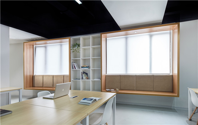 在78平空間內布置20個工位、茶水間、會議室和一個獨立辦公室并不容易,設計師在平面功能最大化,營造豐富的灰空間,消除辦公空間以往嚴肅緊張的固有印象。黑白極簡的設計語言在節省造價的同時完美契合了IT公司的現代感與科技感,而木質的飄窗是整個黑白空間的一抹暖色,在有限的面積中為員工營造了輕松的閱讀與交流空間。豐富的玻璃隔斷形成通透的空間,相互貫穿,模糊了空間屬性,從而削弱小空間帶來的局促感。
