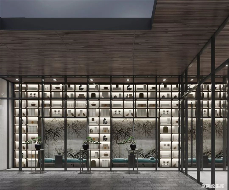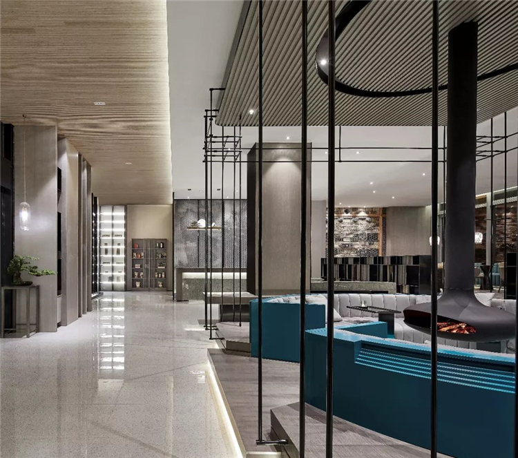 傳統(tǒng)與現(xiàn)代的融合變通,通過汲取傳統(tǒng)徽派的木構(gòu)斗拱、瓦片、留白的山墻和民居的水墨意境,運用新的材料進(jìn)行演繹,如水磨石的地面、背景墻藝術(shù)圖案結(jié)合金屬網(wǎng)、半透的夾絲玻璃、黑色的金屬構(gòu)建.以寫意的方式提取徽州的意境,延續(xù)徽派建筑的黑白兩色,再點以中國傳統(tǒng)色系軟裝搭配,表達(dá)了設(shè)計對傳統(tǒng)的回歸和未來的展望.