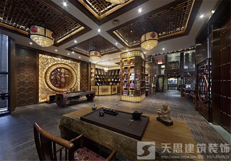 古典中式裝修茶樓會所大廳設計溫馨寬敞散發著獨特的茶文化,整齊有序紅木茶展柜色澤渾厚且秀麗透亮,嵌入式方格天花吊燈搭配現代感極強的紅木圈椅含蓄而內在,泡一杯清茶,品味葉的裊娜,水的清澈,便有了清風自來的心爽。