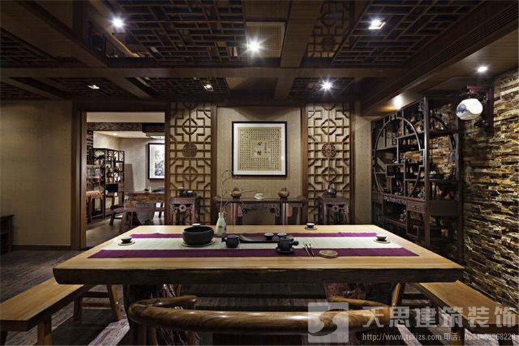 古典中式裝修茶樓會所空間裝飾有極強的設計感,高低錯落的掛畫與格柵窗落增加茶室的藝術美,原色原味的樹根茶幾集實用與欣賞一體,泡一杯清茶,就進入了一片碧綠的天空,這里將成為愛茶人士的最愛。