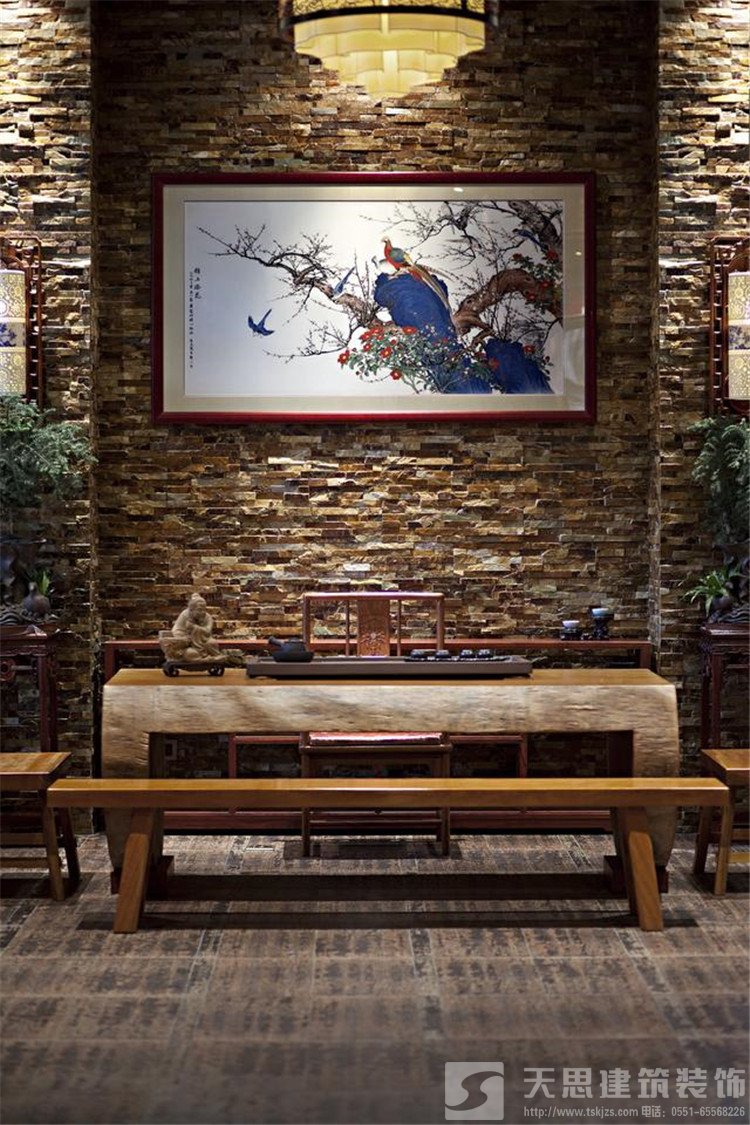 現代時尚吊燈配以明式簡約紅木圈椅平添幾分現代生活氣息的景致芳華韻味。風景優美的水墨畫與絕妙雕工的座屏形成一種無言的美。大氣凜然的中式天花板吊頂將屋里的一切照的豐富多彩,妙趣橫生。
