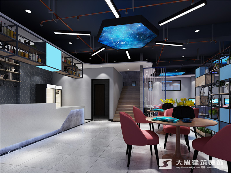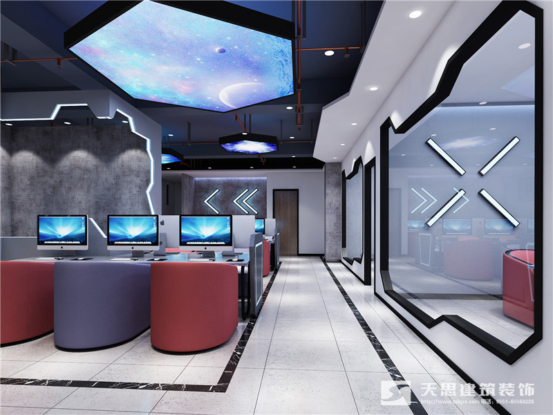 根據(jù)業(yè)主的要求,網(wǎng)咖設(shè)計(jì)的整體顏色以淺色為主,中間穿插對(duì)比強(qiáng)烈的撞色系來展現(xiàn)效果。