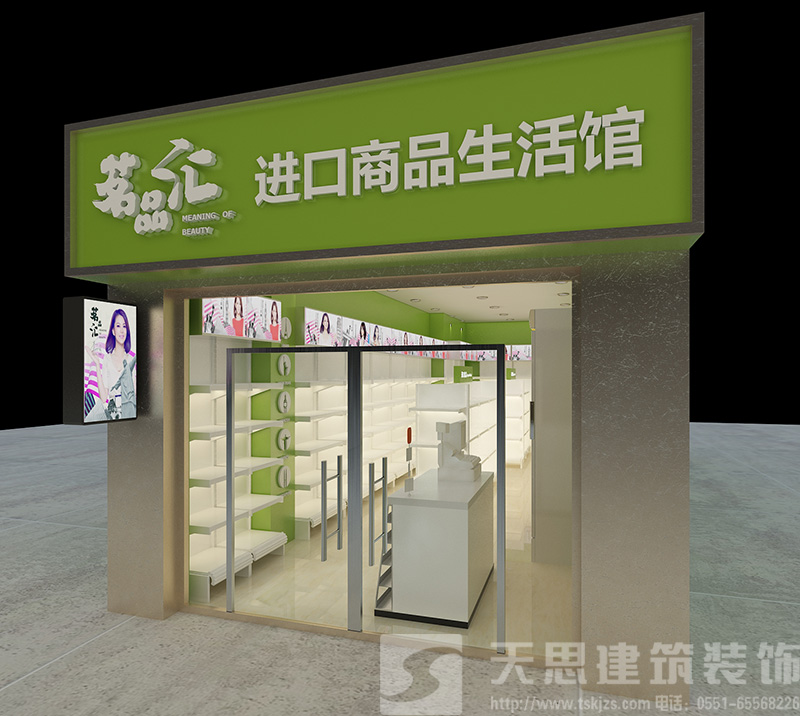 項目名稱:茗品匯進口商品生活館 設計師:汪袁 面積:40平米 項目地址:包河區海關路 設計簡介:進口商品生活館門頭刷上清新的綠色乳膠漆,鑲嵌白色發光體