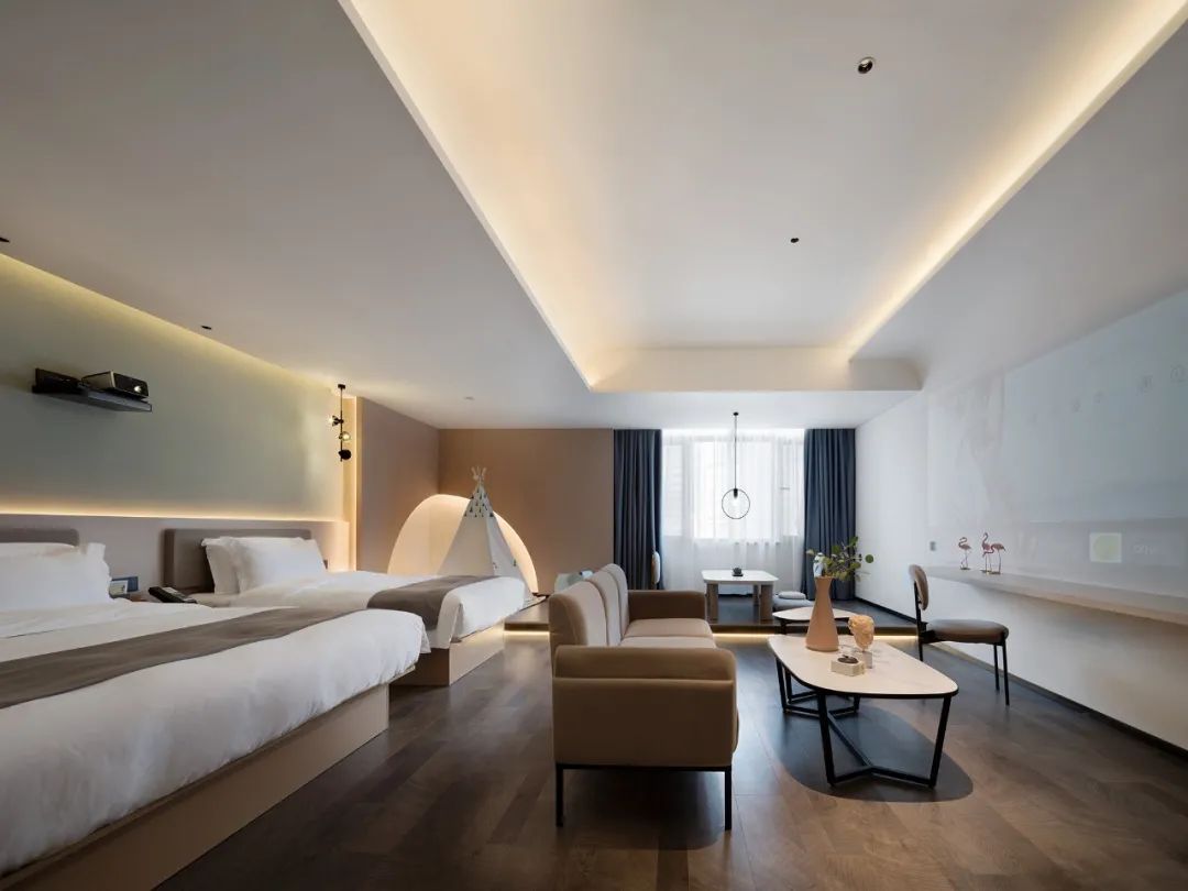 在線條曲度與建筑結(jié)構(gòu)的銜接中交融出感性層面的驚喜,令入住者“循著光”下榻酒店,在體驗(yàn)與感受中為空間注入當(dāng)下的即時(shí)形態(tài),由此,人在空間里是造訪者亦是著境者,是觀賞者,亦是參與者。情與境中,無盡遐思。