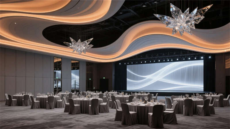全日餐廳以陶土色格柵天花呼應徽州傳統工藝,吹制玻璃吊燈如晨露凝結空中;宴會廳則化身未來劇場,波浪形織物天花與全息投影幕布共舞光影。行政樓層的商務休息區,深灰毛氈墻面與古銅金屬細節沉淀出理性優雅,窗外綠意透過玻璃隔斷滲入交談空間。從屋頂無邊泳池俯瞰,建筑與巢湖的瀲滟水色遙相呼應,于繁華處開辟一方隱逸凈土——這里不僅是居所,更是一場喚醒感官的設計敘事。