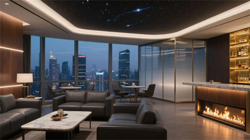 最驚艷的屋頂花園酒吧,木格柵切割都市夜空,發光吧臺與夜光植物墻在霧化玻璃間若隱若現,火光與星空投影為每杯特調注入故事感。這座酒店不止是棲居之所,更是一場穿越材質、光影與城市天際線的沉浸藝術展。