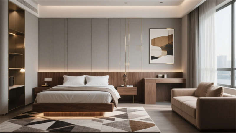 以低飽和度中性色調為基底,這座酒店將現代輕奢美學與在地文化氣韻悄然相融??臻g以胡桃木的溫潤、金屬線條的利落與自然光影的詩意共筑視覺語言,藝術裝置如隱形的敘事者串聯起流動的場域精神。