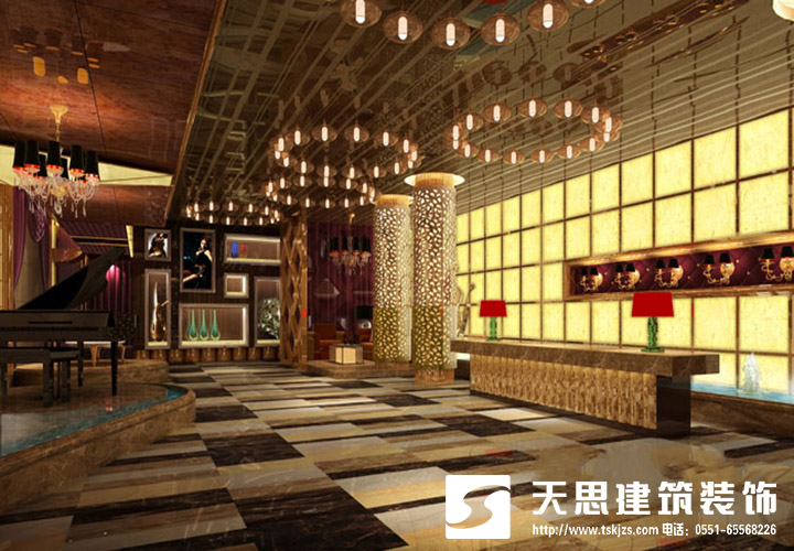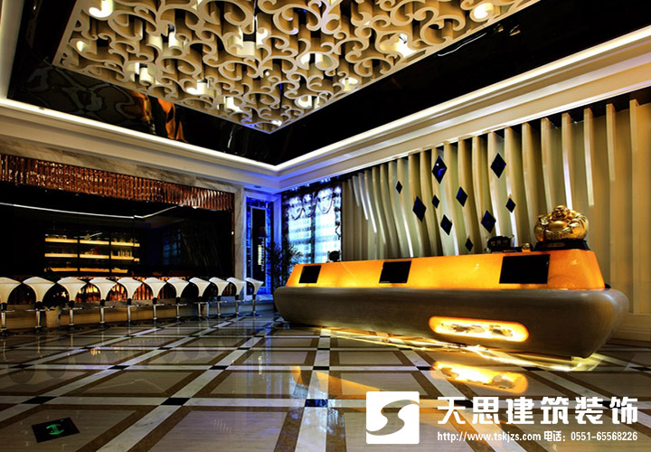 項目名稱:合肥潮流KTV裝修設計 設計面積:800平方 項目地址:安徽省合肥市 合肥潮流KTV裝修設計,金銅色的燈光耀眼而又溫馨,大理石般的地板,更是襯托出了大廳的