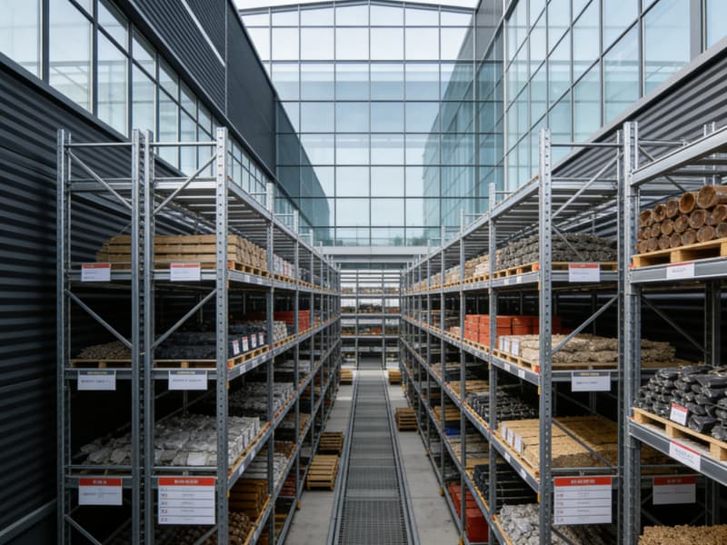 原料存儲區(qū)運用立體式金屬貨架,極大提升空間利用率,不同類別的原料分區(qū)明確,標識清晰,方便取用與管理。