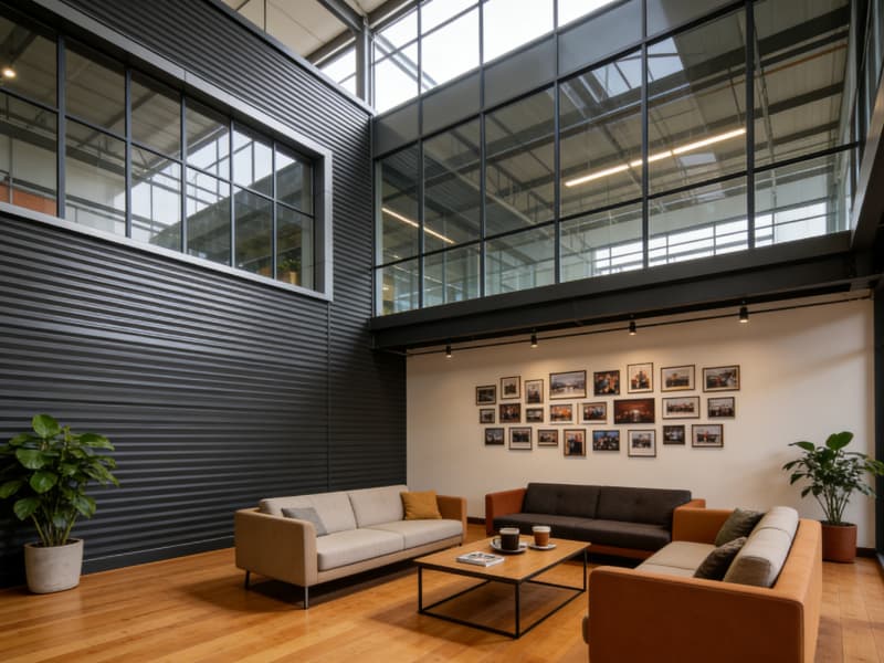 從外觀上看,廠房整體以深灰色為主色調(diào),搭配淺灰色的線條勾勒,呈現(xiàn)出沉穩(wěn)大氣的質(zhì)感。墻面采用金屬材質(zhì)與玻璃幕墻相間的設(shè)計,既保證了建筑的堅固性,又增強了采光與通透感,讓建筑在工業(yè)氛圍中不失現(xiàn)代氣息。