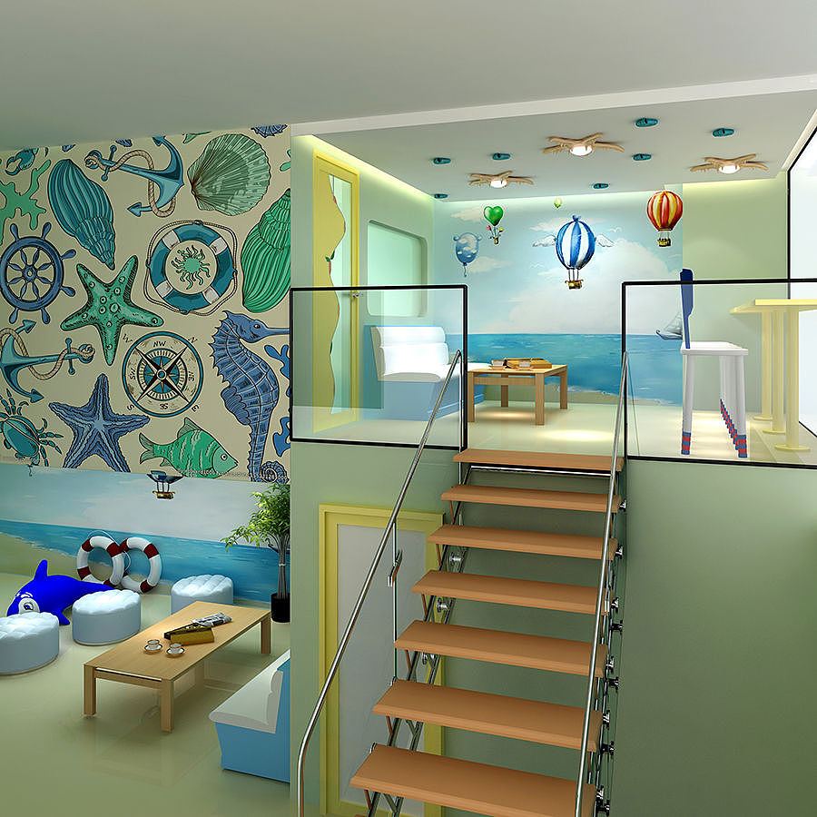 該設計以海洋樂園為主題,整體設計,顏色繽紛艷麗,造型充滿童趣,讓大人和孩子都樂在其中.每個空間又都有他不同的味道,但最終都和親子這個元素相呼應,親子,海洋,樂園,這幾種元素融合在一起,一定是一個美妙的兒童天堂.