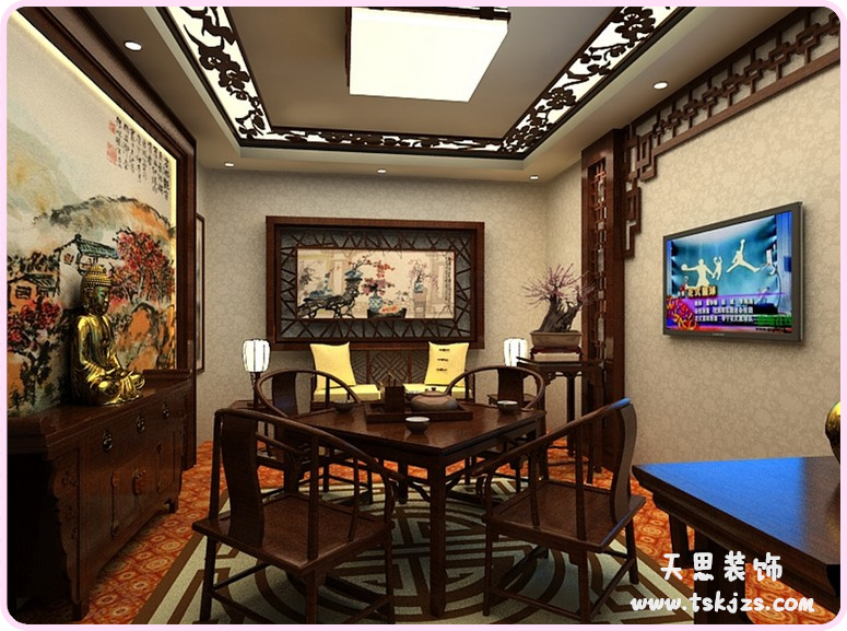 設(shè)計思路:以仿清代室內(nèi)布置為主.用清式家具和窗花、字畫、木欄干等管造古色古香的氛圍。廚衛(wèi)和孩子房則以現(xiàn)代裝飾手法為主。古為今用、古今結(jié)合,創(chuàng)造居空新風(fēng)貌。