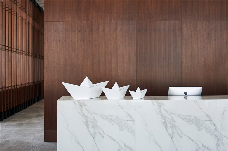 大堂和餐廳的內(nèi)部特色是光滑的白色石膏墻壁、大理石、黃銅和深色的木材家具。這里用了一個白色,純凈,簡單的立面,走進里面,仍然會感覺到白色,但同時我們使用了一些其他的材料。所有的顏色都來自真實的材料,讓你進入室內(nèi)時更溫暖。