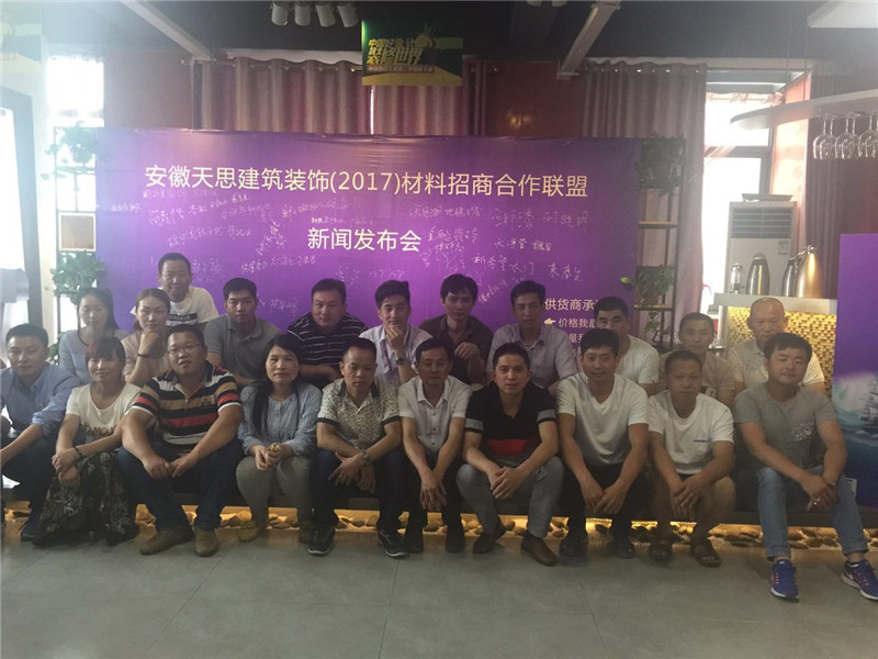 2017年6月4日,安徽天思建筑裝飾(2017)材料招商合作聯盟新聞發布會在合肥公司召開,來自合肥的三十余家知名材料商代表與天思裝飾公司領導齊聚一堂,共敘商情。在天思這個平臺上