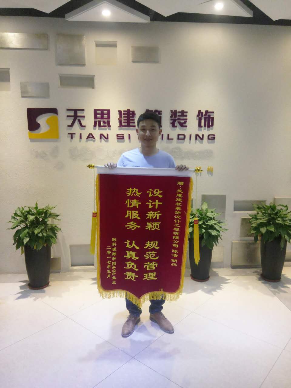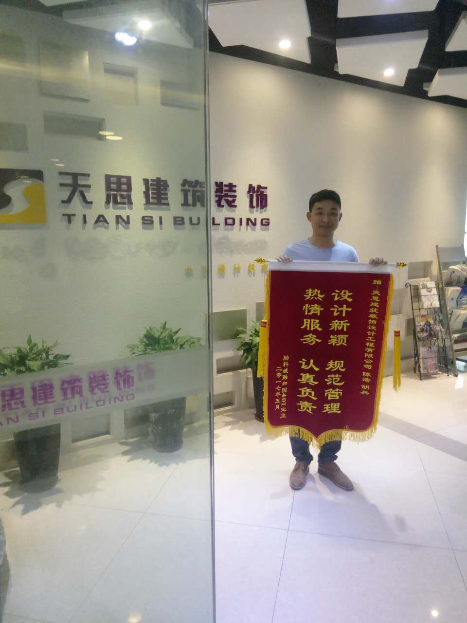 “服務(wù)熱情素質(zhì)好,辦事認(rèn)真效率高”是業(yè)主對(duì)天思裝飾的肯定。一直以來,天思裝飾的全體員工都盡力做好每一家的裝修工程,同時(shí),業(yè)主為天思裝飾送來錦旗,也讓我們很是感動(dòng)。