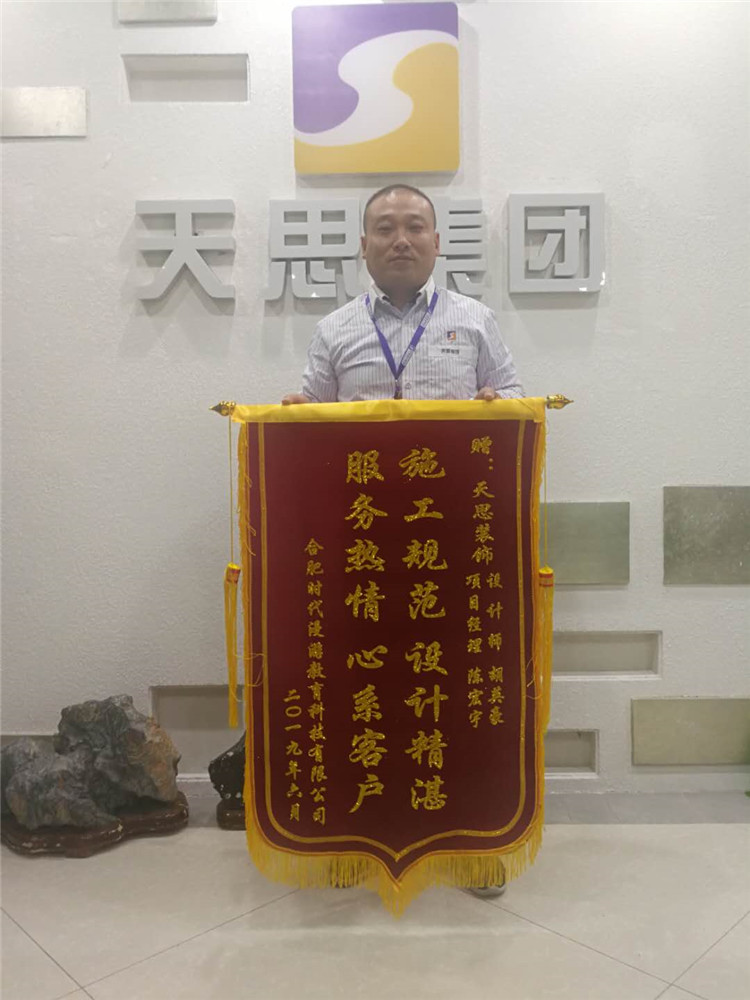 在送錦旗時,業主還贊道:"天思裝飾的陳工工作認真、負責、敬業,和他打交道我很放心", 開工裝修時候正是酷熱的夏天,負責裝修的陳工每天都在工地,每個環節都主動和他溝通,更重要的是在很多方面提出合理的建議;有問題就及時整改,從材料進場的嚴格把關,到施工過程質量的嚴格控制.這份誠懇敬業的態度讓他非常感動.