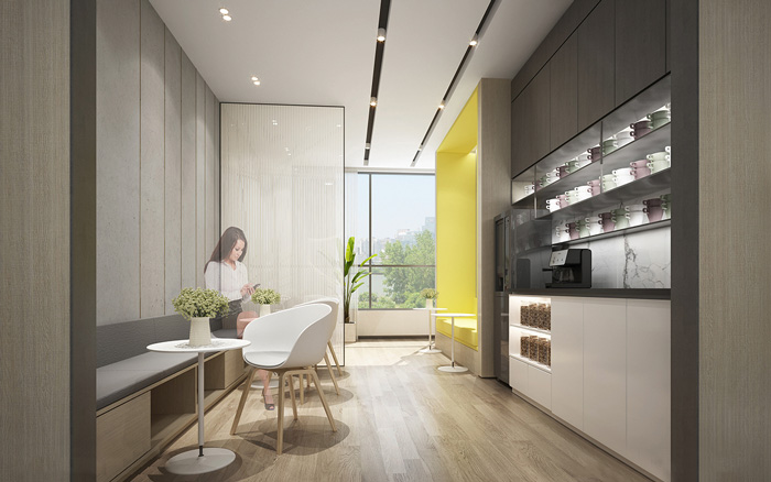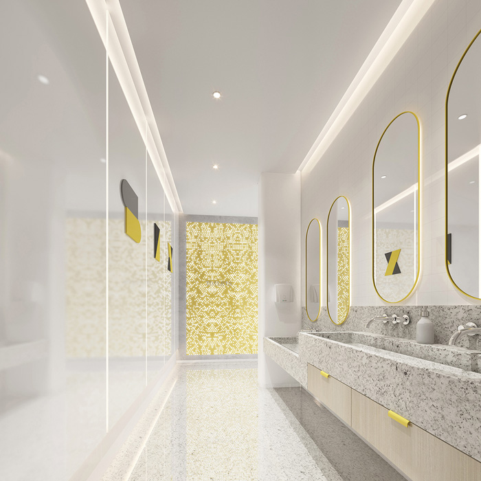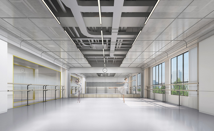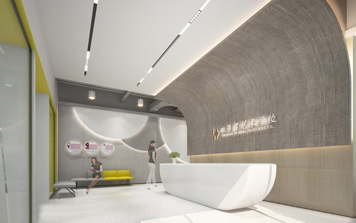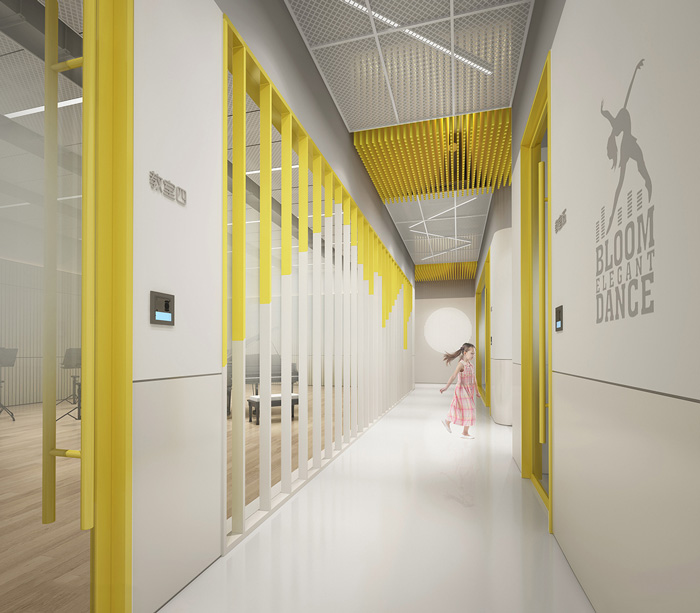 此處藝術學校設計中,告別了五彩斑斕的顏色,突出了空間的簡潔與干凈,用黃色做為點綴色提升空間的趣味性。