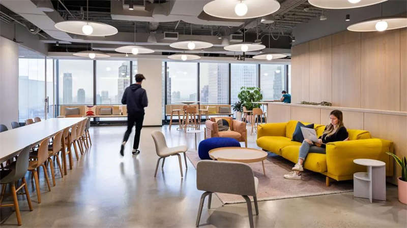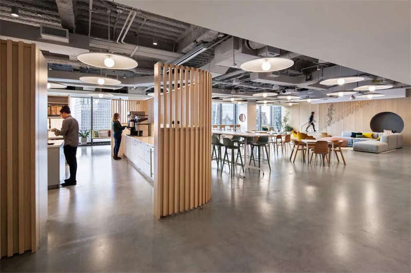 超大的開放式工作區,其間穿插點綴著各式協作空間——從會議室到電話亭應有盡有。兩個樓層都在建筑西側規劃了大而開敞的公共區域,這里享有廣闊的城市景觀視野和充足的日光,并通過一座木制樓梯上下緊密連接。