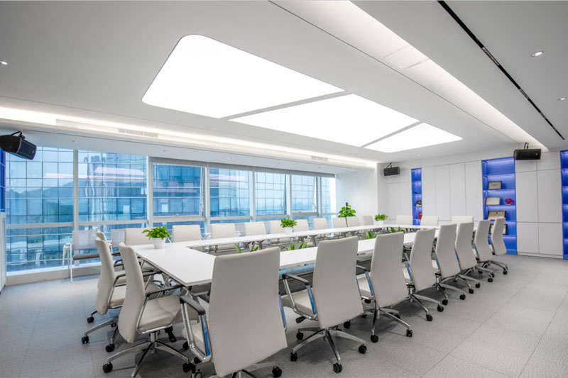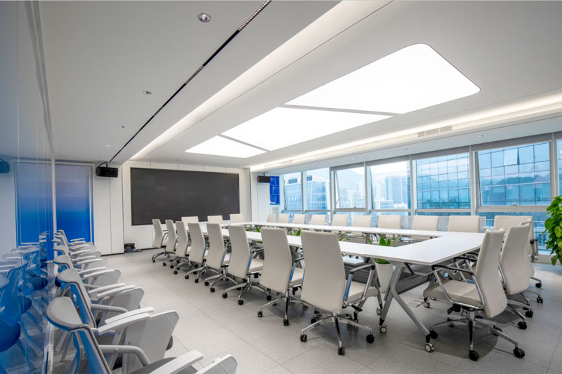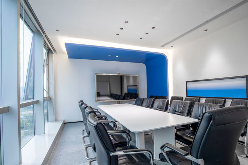 大小會議室都延續了空間的藍色基調,利用通透的藍色玻璃分隔過道,使空間更加通透明亮,不僅讓視感增強,也深刻的加強了品牌形象在訪客心中的作用。