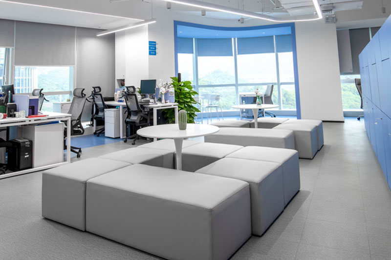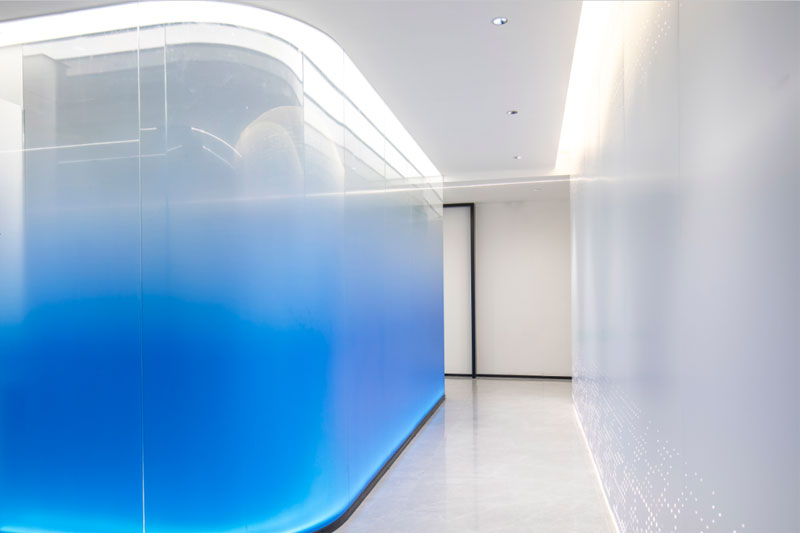 為了體現客戶的品牌形象和影響力,設計師將“創新、科技、便捷”的理念融入到空間的每個環節,從企業的VI色中提取出藍色運用到整體空間中。