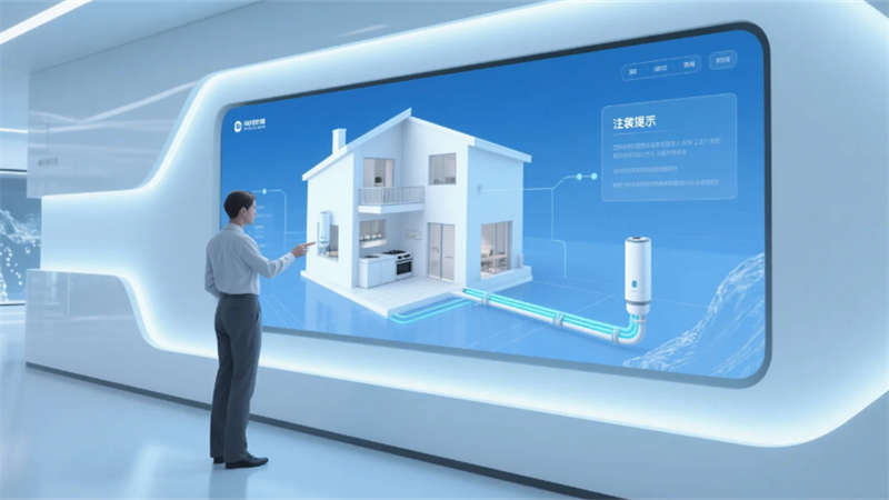 展廳以環(huán)形動線串聯(lián)六大核心模塊:入口10米寬LED水幕墻動態(tài)演繹凈水原理;中央懸浮式產(chǎn)品矩陣展臺,通過全息投影拆解RO膜過濾技術(shù);實景化場景區(qū)1:1復(fù)刻家庭廚房、商務(wù)辦公樓及工業(yè)廠房,搭配交互式水質(zhì)監(jiān)測實驗臺;獨創(chuàng)的“虛擬管家”AR系統(tǒng),可生成個性化凈水方案并投射至合肥典型戶型模型。空間頂部采用參數(shù)化設(shè)計的波浪形燈網(wǎng),象征長江與淮河水系交匯,地面嵌入城市節(jié)水?dāng)?shù)據(jù)可視化地磚,凸顯本土環(huán)保責(zé)任感。