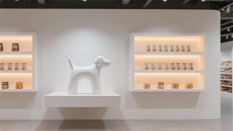 本展廳以現(xiàn)代簡約風格為核心,融合自然元素與科技互動,打造沉浸式寵物用品體驗空間。設計采用純凈的灰白色基調(diào),搭配淺木色與綠植,傳遞生態(tài)友好理念;開放式布局確保視線通透,弧形展臺與線性燈光引導參觀動線,營造流暢舒適的瀏覽體驗。